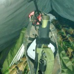 Regnet plasket godt ned da jeg befant meg midt inne i skogen, hvor jeg hadde fått lokalisert to passende trær (trodde jeg). “Som vanlig” stod trærne litt for nærme, men det dugde med noen små modifikasjoner til “diamant” taket jeg satte opp med fjellduken. Jeg satte først opp taket, slik at soveposen og resten av utstyret holdt seg tørt under taket. Etter ca. 10 minutter (inkludert og spikke til 6 stk teltplugger) lå jeg i hengekøyen under taket … og for en følelse! Å ligge der og dingle i øs-pøs-regnevær, trommingen på duken er særdeles søvndyssende for meg.